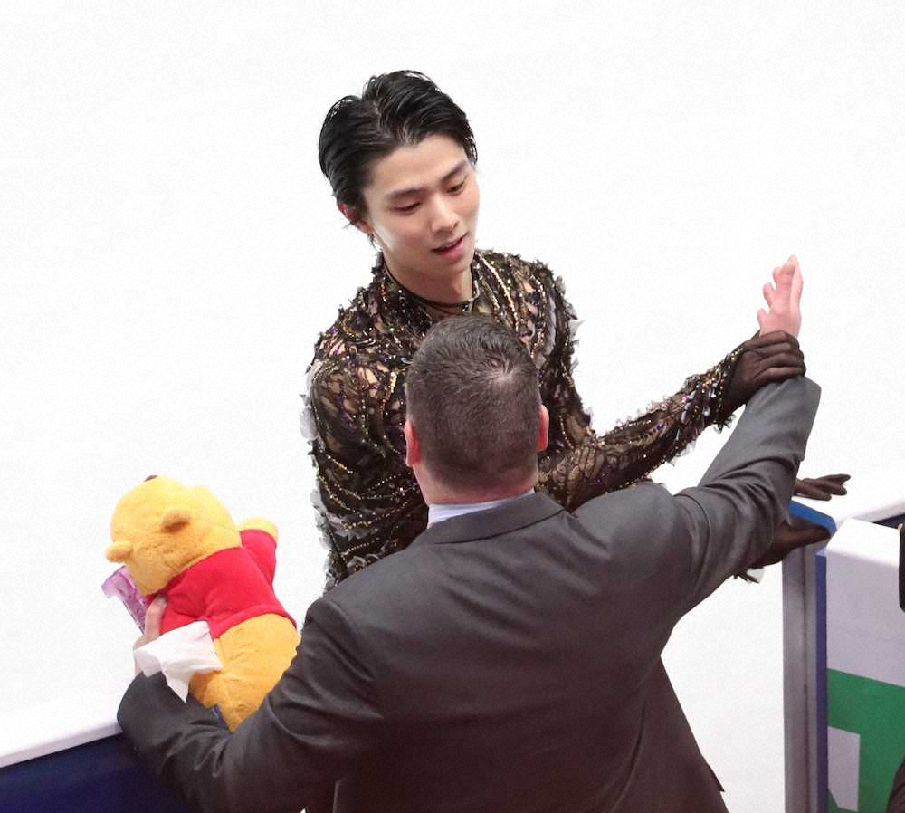演技を終えオーサーコーチに迎えられる羽生結弦(撮影・長久保豊)