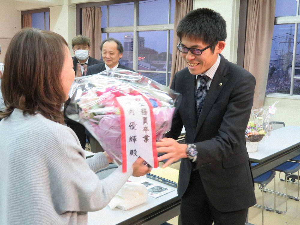 同僚から花束を贈られる川内