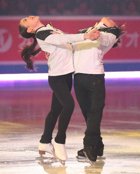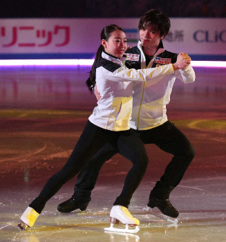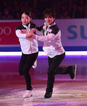 <世界フィギュアスケート国別対抗戦第4日>エキシビション、チーム日本の演技で「だんご3兄弟」にのり踊る紀平梨花と宇野昌磨(撮影・小海途 良幹)