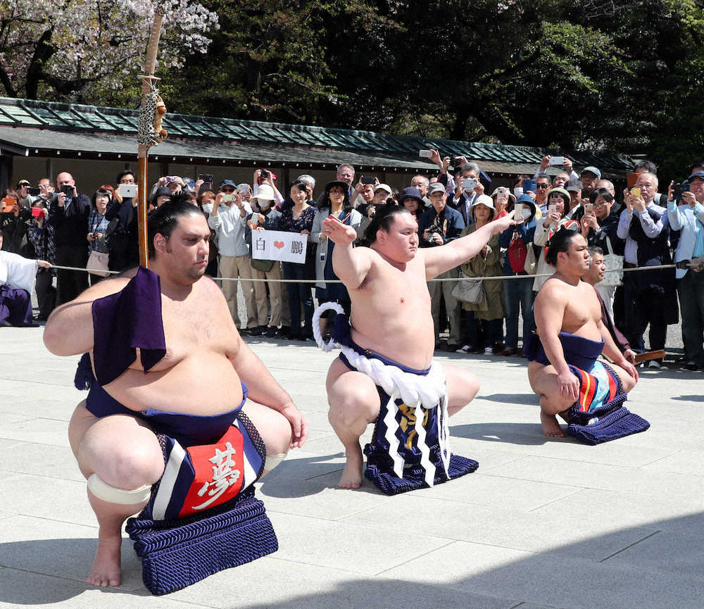大相撲の春巡業は15日、東京・靖国神社で行われ、白鵬(宮城野部屋)と鶴竜(井筒部屋)が同神社創立150年の節目で、特別に拝殿前で奉納土俵入りを行った。白鵬は09年の創立140年、15年の戦後70年に続く、3度目の拝殿前での土俵入り。右上腕の負傷で取組から外れているが、同神社相撲場でも土俵入りを披露し「久しぶりに1日2回やった。いい汗をかいた」と笑顔を見せた。