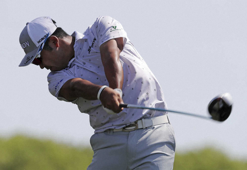 第3ラウンド、10番でティーショットを放つ松山(AP)