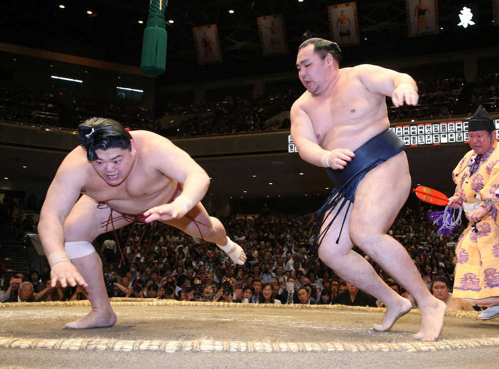 一人横綱の鶴竜は阿炎の喉輪で上体が起き上がりながら、冷静に対処してはたき込んだ。「相手を見て変な引きを出さないようにした。下がらない限り大丈夫と思った」。