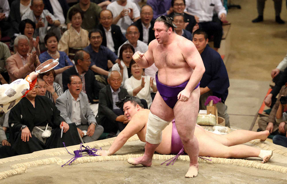 朝乃山 行司差し違え白星、再びトップ 14日目にも初V
