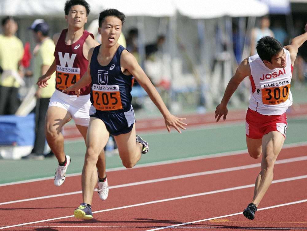 関東学生対校選手権の男子100メートルを制した東洋大の宮本(中央)