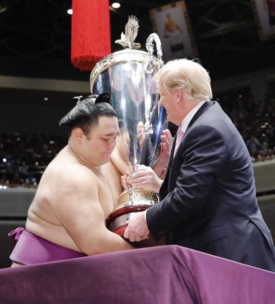 身長1メートル87の朝乃山が上目遣いになった。令和最初の本場所、最後を締める表彰式は珍しい光景が繰り広げられた。身長1メートル90のトランプ米大統領から賞状と米国大統領杯を直接、授与された。三役経験すらないまま初優勝した25歳は日本語で「ありがとうございます」と繰り返し恐縮。「言葉に表せないぐらいうれしかった。“トランプ杯”は重かった。賜杯と変わらなかったかな。大統領はデカかった」。生涯の思い出となりそうな体験を率直に喜んだ。