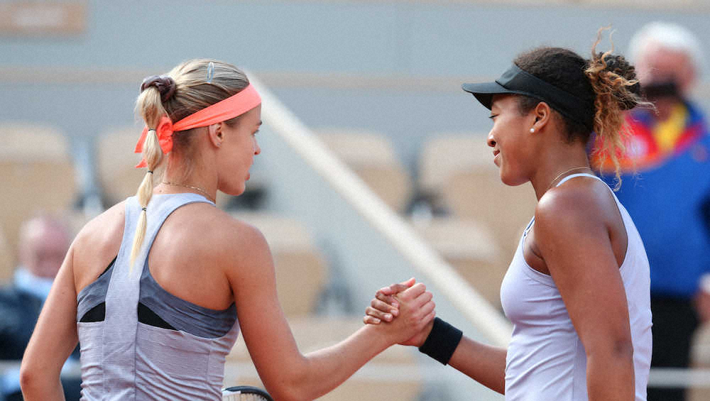 シェミエドロバ(左)と握手をする大坂(撮影・小海途 良幹)