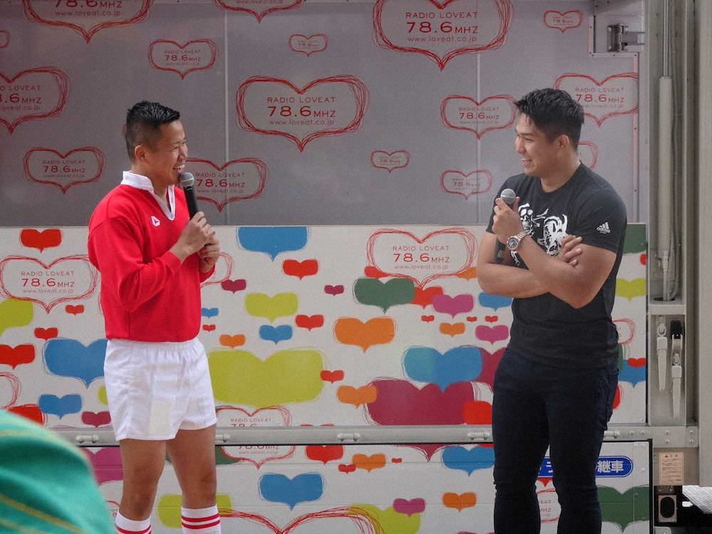 ラグビー日本代表候補の姫野和樹(右)は帝京大ラグビー部の先輩、お笑いタレントのしんやと豊田スタジアムでトークショー