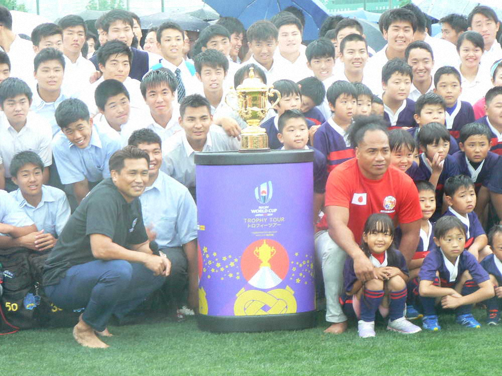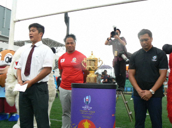 ラグビーW杯の優勝トロフィー「ウェブ・エリス・カップ」が、日本の全12開催都市を中心に巡るトロフィーツアーの一環として14日、東大阪市花園ラグビー場で披露された。第1グラウンドは芝養成中のため使用できず、第2グラウンドで展示された。
