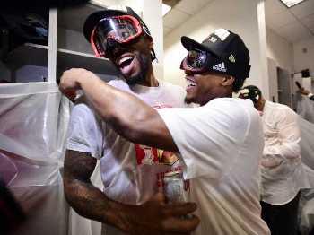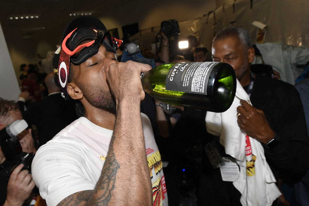 NBAファイナルで5年ぶり2度目のMVPとなったラプターズのカワイ・レナード(27)は、ゴーグルを装着してアリーナ内でのシャンパン・ファイトに参加。同僚のカイル・ラウリー(33)やサージ・イバカ(29)と“泡”をかけあって喜びを爆発させていた。