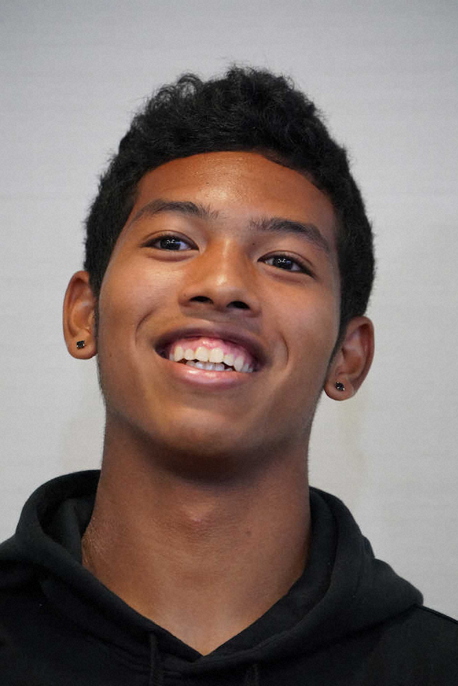 笑顔で報道陣の質問に答えるサニブラウン(撮影・沢田 明徳)