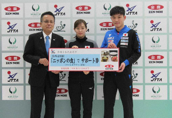 全農は2011年から日本代表のオフィシャルスポンサーとなって日本の食を通じてサポートしてきた。今後はワールドツアーに出場する海外遠征時にも支援することを約束。2人が代表して神出代表理事理事長から「ニッポンの食でサポート券」を受け取った。世界を舞台に戦う選手にとって、日本の食がパワーの源になっている。