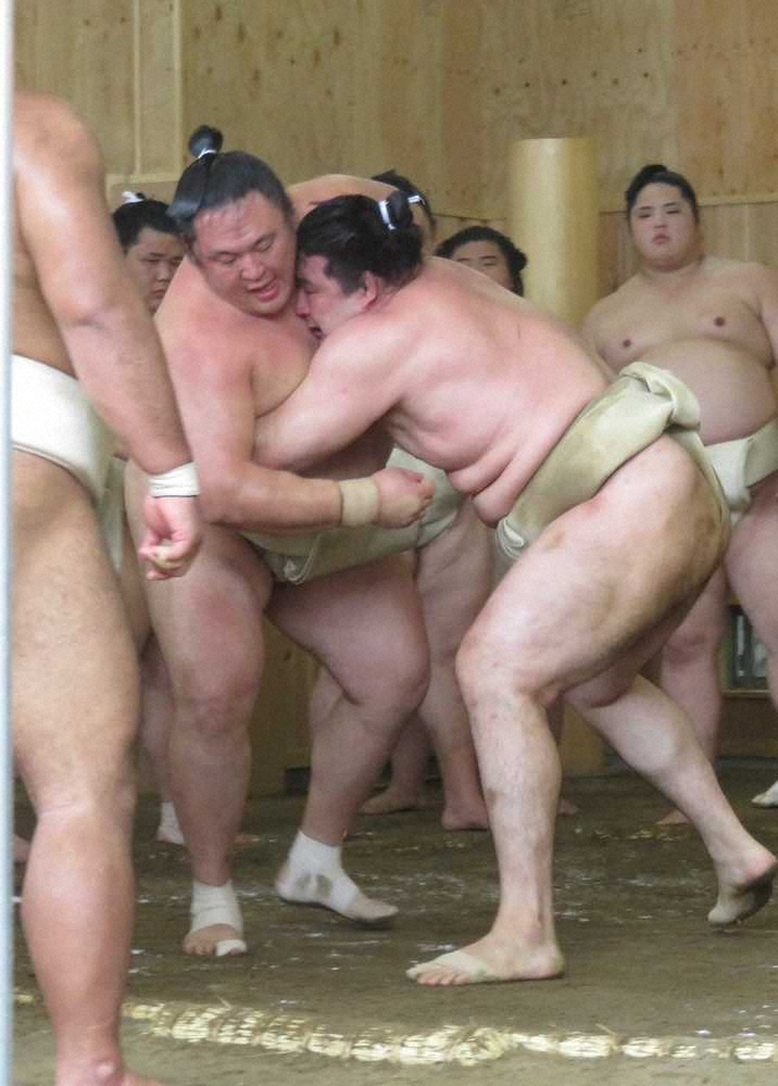 この日は右膝を痛めている大関・貴景勝(22=千賀ノ浦部屋)に加え、大関・高安(29=田子ノ浦部屋)も連合稽古を欠席した。関係者によると、高安は腰痛のため万全ではなかったもよう。両大関が不在の中、番付最上位の玉鷲が関取衆の申し合いで竜電をつかまえ連続5番取った。玉鷲が竜電を送り出しで破ると「もう一丁」と土俵に戻し、その後の2番でも自分が勝っても竜電を相手にした。横綱、大関を除いて、申し合いの途中に同じ相手と連続して5番取るのは異例のこと。仕上げのぶつかり稽古でも竜電に胸を出し、約3分、しごいた。