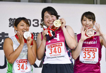 自己記録を3メートル66更新し、60メートルの壁を破った美人スローワーは安どの表情を見せた。「やっとですね。自分の中で壁じゃないですけど、59メートルを何度も投げていたのに60を超えられなくて。突破できたことをうれしく思います」。足がつった4投目から立て続けにファール。「もしかしたら記録を伸ばせないかも」と不安を感じながら、最終投てきは「どうなっても良いから思い切り投げよう」と腕を振り切った。最後は体勢を崩してやりの軌道を確認できなかったが、3位入賞の山内の「60いってますよ!!」という言葉に歓喜した。