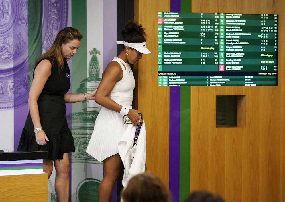 初戦敗退後の記者会見を打ち切り、退出する大坂(右)