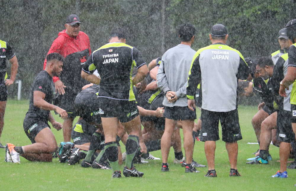 日本代表のジョセフヘッドコーチ(左上)は雨中でのスクラム練習を見守る(撮影・中出健太郎)