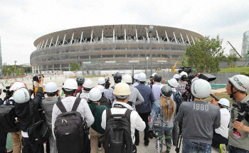 報道陣に公開された新国立競技場の建設現場(撮影・吉田 剛)