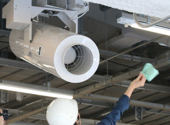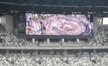 【設備】まるで避暑地!?暑熱対策にも余念がない。内部に足を踏み入れると風が吹き抜け、外の蒸し暑さがウソのような自然な涼しさ。客席の背後には筒状の気流創出ファンが1周185台設置され、緩やかな風を届ける。ゲート付近の8カ所に設置予定のミスト冷却設備も順次取り付けられており、気化熱で体感温度を下げる役目を果たす。南北にはフルハイビジョンの大型映像装置が設けられた。席が遠くてもご安心を。超高画質で選手の表情やプレーを見ることができそうだ。