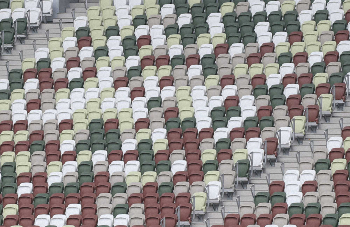 【観客席】客席は6万席のうち4万5000席が設置され、7割強の完成度。オレンジや青の原色だった座席は白、黄緑、グレー、深緑、濃茶の5色の「アースカラー」に大変身した。木材の屋根から降り注ぐ日の光をイメージし、フィールドが近付くにつれ濃い色になるグラデーション仕様に。ランダムに並べて空席を目立ちにくくするのは、選手の士気が下がらないようにするナイスな演出だ。一見モザイク柄に見えるところも、日本の落ち着きと五輪のにぎやかさが共存しているかのようだ。