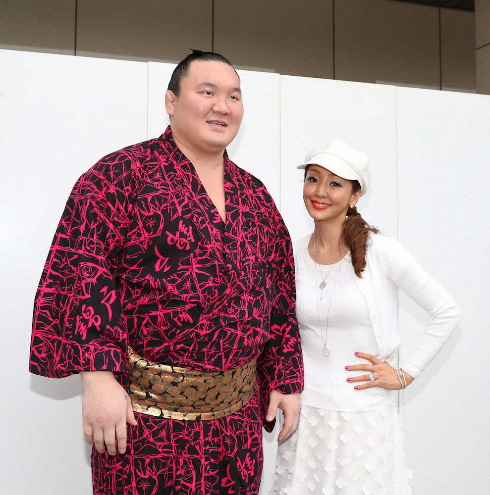 <大相撲名古屋場所9日目>白鵬(左)と記念撮影をする神田うの(撮影・坂田 高浩)