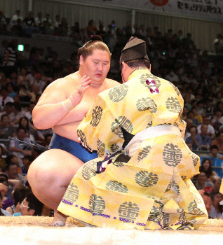 前頭4枚目・逸ノ城が横綱・白鵬の連勝を8で止めた。左上手を取って得意の体勢に持ち込むと迷わず前に出て最強横綱から初めて金星を奪った。横綱・鶴竜は明生を冷静に寄り切り、9戦全勝で単独トップに立った。大関・高安は正代に突き落とされ、2敗目。勝ちっ放しの鶴竜を1敗で白鵬が追う展開となった。