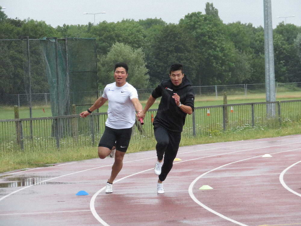 陸上のダイヤモンドリーグ第10戦を前に、バトンパスの練習をする小池(左)と桐生