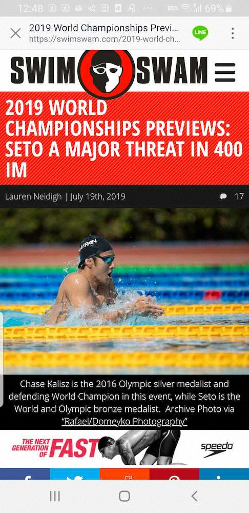 韓国・光州で開催中の水泳世界選手権は大会10日目の21日から競泳がスタートする。大会最終日28日の男子400メートル個人メドレーで金メダルを狙う瀬戸大也(25=ANA)が、水泳王国アメリカの水泳専門サイト「SWIM SWAM」から「最大の脅威」と警戒された。