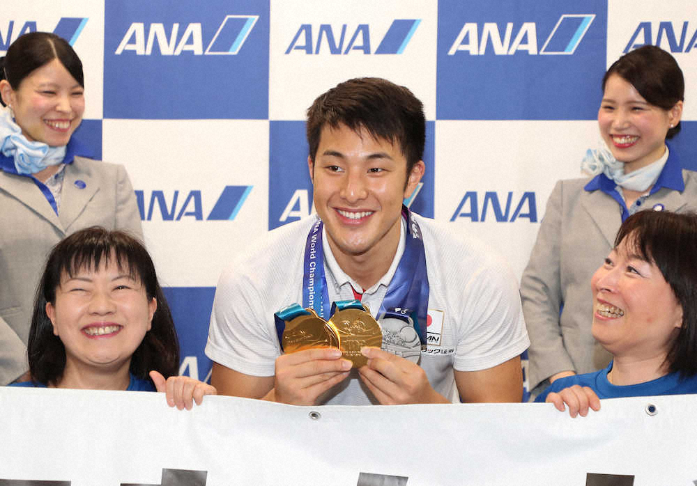 水泳世界選手権(韓国・光州)で男子200、400メートル個人メドレーで金メダルを獲得し、来年の東京五輪代表に内定した瀬戸大也(25=ANA)ら日本代表選手団が29日、羽田着の航空機で帰国した。瀬戸が内定したことで、両種目の五輪代表枠は残り1。短水路で行われる今週末のW杯(8月2~4日、東京・辰巳)で、長期休養から約半年ぶりに復帰するライバル萩野公介(24=ブリヂストン)に何よりの発奮材料を贈った。