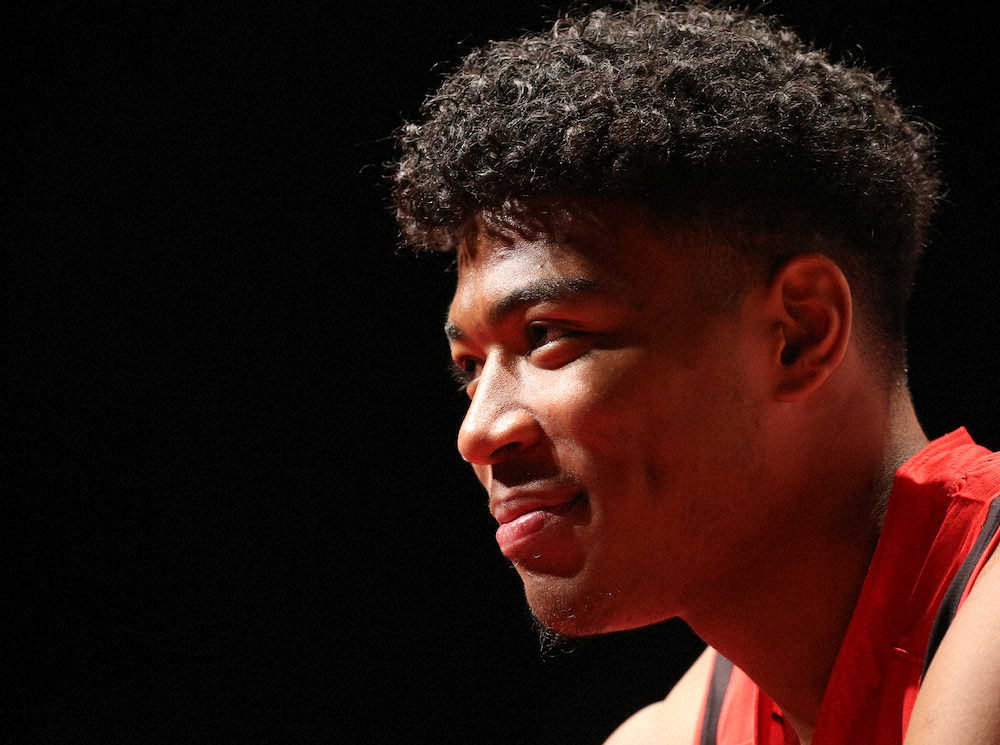 笑顔で会見する八村(撮影・吉田 剛)
