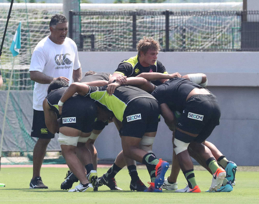 【相手にぶつかる瞬間大きなパワー加える】タックルの合言葉は「セイム・ショルダー、セイム・レッグ」だ。相手にぶつかる瞬間、肩と足の向きをそろえることで、大きな力が加わるという。キッドウェル・コーチの教えだ。最初の当たりで相手に押されてしまえば、肘を狙うことも、2人目がボールに絡むことも難しくなる。W杯1次リーグで同組のロシア、アイルランド、サモア、スコットランドという力自慢の相手に当たり勝つために、ハンセン・コーチは「タックルスキルを上げる時間をつくりたい」と引き続き個人練習の枠を設ける考えだ。