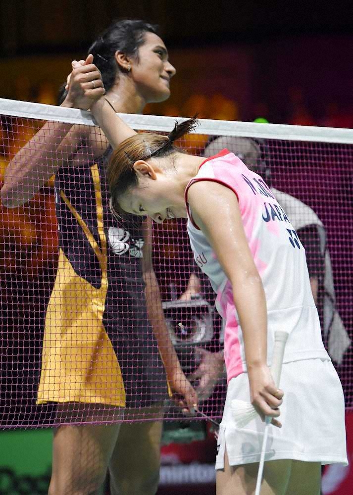 女子シングルス決勝で、世界ランク4位の奥原は2年ぶりの女王返り咲きはならなかった。同5位のプサルラにストレートで圧倒された。長身から鋭いスマッシュを打ち込まれ、奥原が得意とするラリー戦でも主導権を握られた。奥原は「結果も内容も情けない。もっといい試合を見せたかった」と泣きながら完敗を認めた。今年1月にプロ転向して以降、初のタイトル獲得はならず。