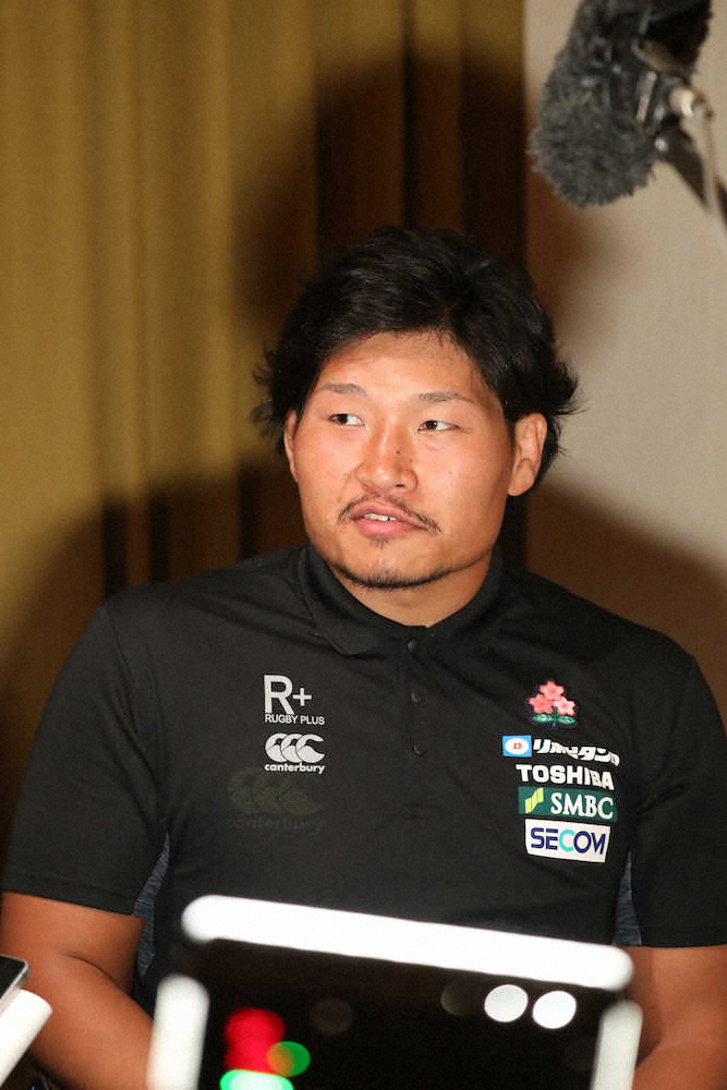 <ラグビー日本代表練習>南アフリカ戦への決意を語る稲垣(撮影・吉田 剛)