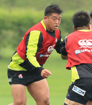 三段目力士に指導する高安(右)ぶつかり稽古で序二段力士に胸を出す高安(右)