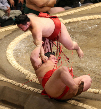 <大相撲秋場所初日>阿武咲(下)をすくい投げで破った炎鵬(撮影・西海健太郎)