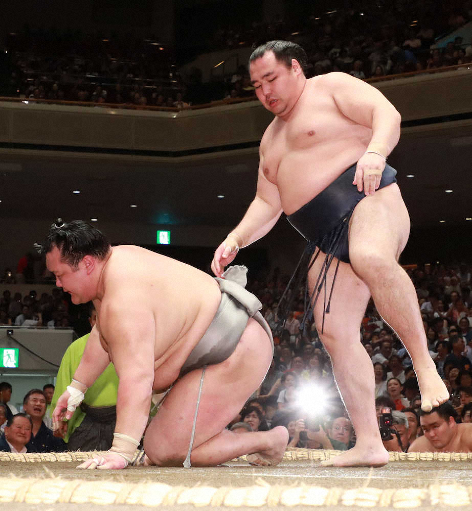 連覇を狙う鶴竜は落ち着き払っていた。初日に白鵬から金星を奪った北勝富士に頭で当たって主導権を奪い、余裕を持ってはたき込んだ。