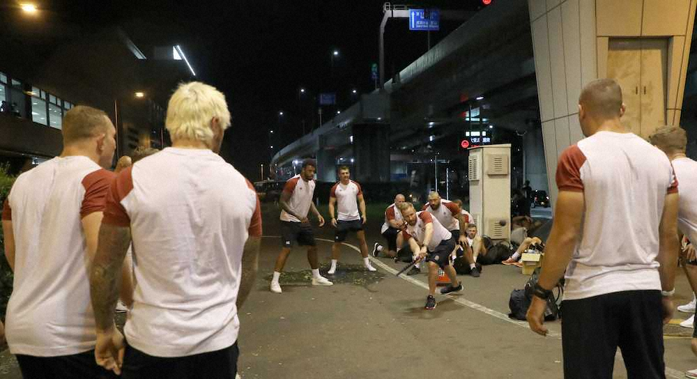 選手たちは同6時半まで待機して到着ロビーに姿を見せたが、それでもバスが来ないため駐車場で始めたのが英国が起源のクリケット。駐車場のパイロンをくいに見立ててミニバットでゴムボールを打ち、当初は疲れた表情だった選手たちも約1時間、歓声を上げながらクリケットに興じた。エディー・ジョーンズ監督(前日本代表ヘッドコーチ)は「クリケットはよくやるんだ」と笑顔で見守っていた。