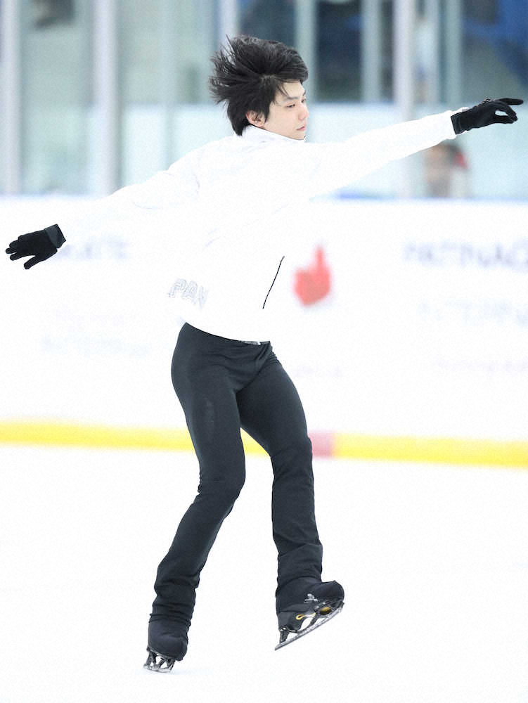 <オータムクラシック・第1日>本番リンクで練習する羽生結弦(撮影・小海途 良幹)