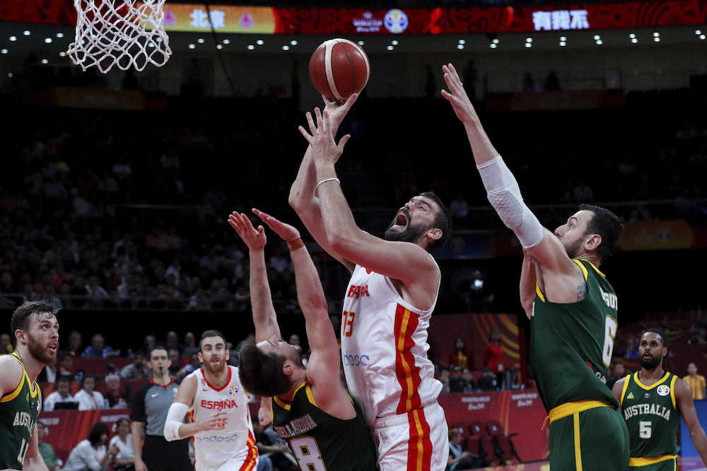 男子バスケットボールのW杯中国大会は13日に北京で準決勝を行い、世界ランク2位のスペインが再延長の末に同11位のオーストラリアを95―88(22―21、10―16、19―18、20―16、延長9―9、再延長15―8)で振り切って3大会ぶりに決勝(15日)に進出。第3Q途中で最大11点を追う展開となりながら、NBAラプターズをファイナル初優勝に導いたセンター、マーク・ガソル(34)が39分の出場で33得点をマークしてチームをけん引した。