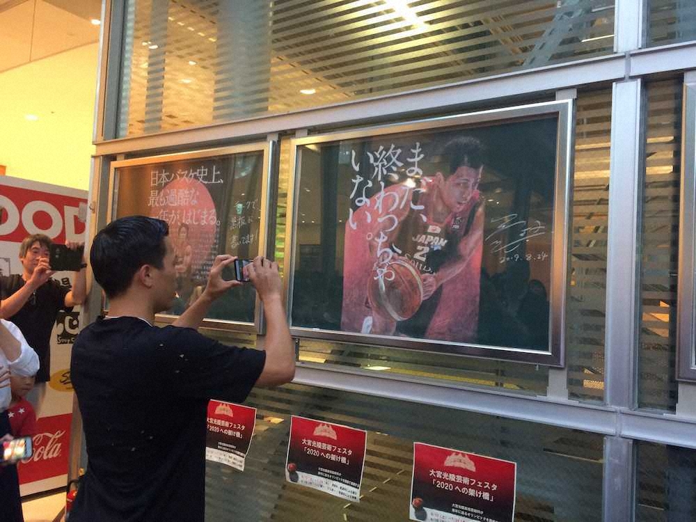 男子バスケットボールW杯開幕前の8月24日。7月の練習中に右手第4中手骨を骨折して日本代表から外れた富樫勇樹(26=千葉)は日本―ドイツの強化試合を視察するため、さいたまスーパーアリーナにいた。会場前のけやき広場には自身を題材に大宮光陵高の美術部が描いた黒板アートが展示されており、試合前に美術部の学生らと交流。サインと日付を書き込み、作品を“完成”させた。鋭い眼光でドリブルする自身の姿とともに記されていたのは、くしくも「まだ、終わっちゃいない」の文字。W杯出場の夢が叶わなかった中、20年東京五輪へ向けて身に染みるフレーズだった。