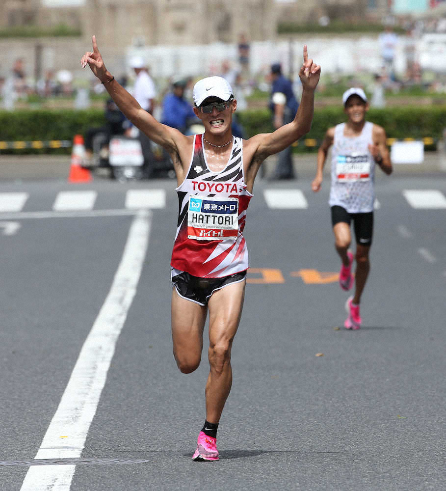 中村は終盤39キロ過ぎにスパート。先頭集団から飛び出し、一度は大迫に追いつかれたが、振り切った。最後は両手を挙げて見事にフィニッシュ。五輪出場内定切符を獲得した。
