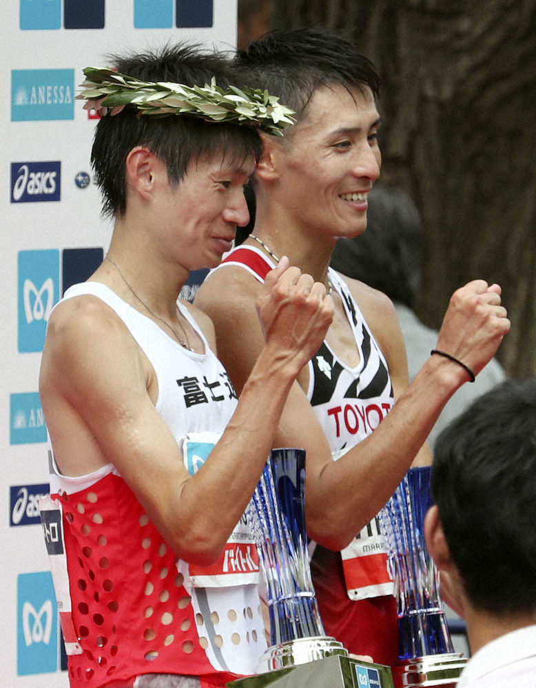 2020年東京五輪のマラソン日本代表に決まり、笑顔でポーズをとる優勝した中村匠吾(左)と2位の服部勇馬