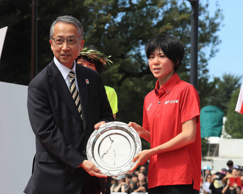 <MGC・表彰式>日本陸上競技連盟・横川浩会長(左)から表彰される鈴木亜由子(撮影・尾崎 有希)