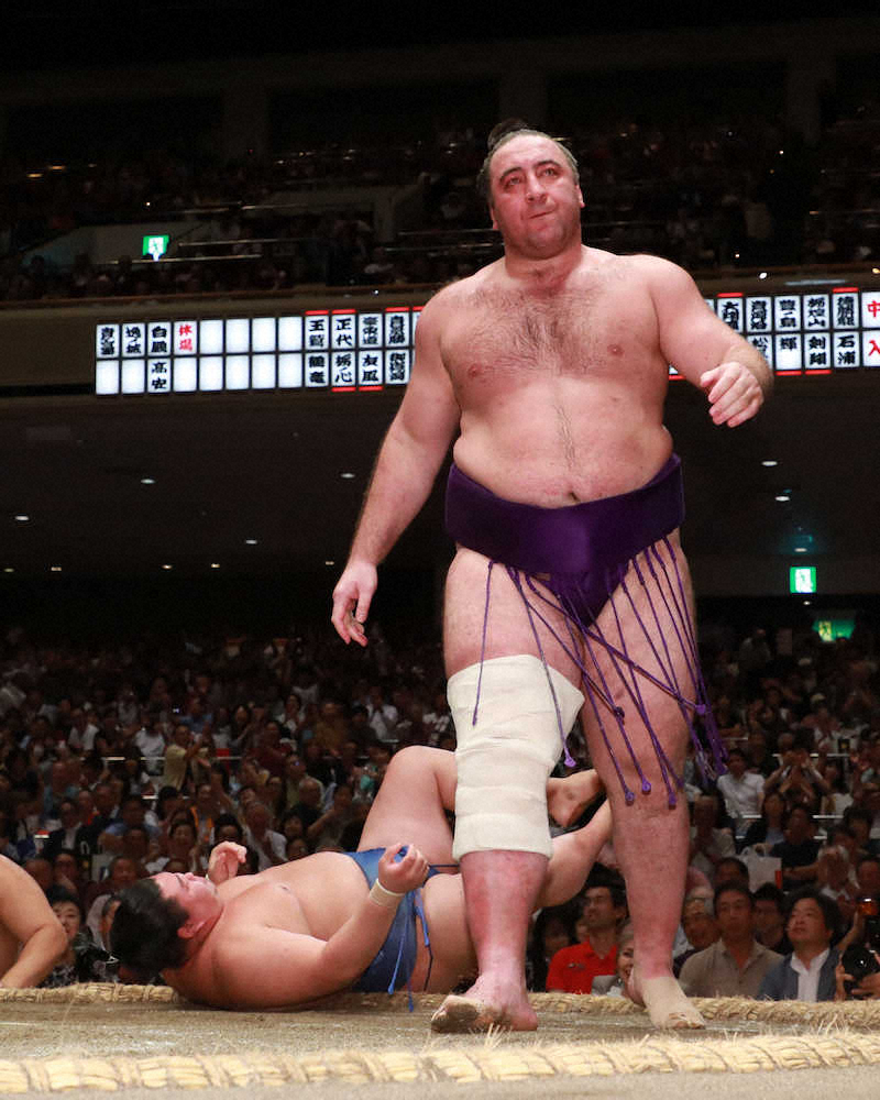 立ち合いから押し込めず、呼び込んで上体が反る場面もあったが、右上手を引いて逆転。「立ち合いの1歩目はいいけど、2歩目の右足が出ない」と不満顔だった。残り7日間で5勝が求められる苦境に「何とか残りたい。気合入れてやります」と闘志をのぞかせた。
