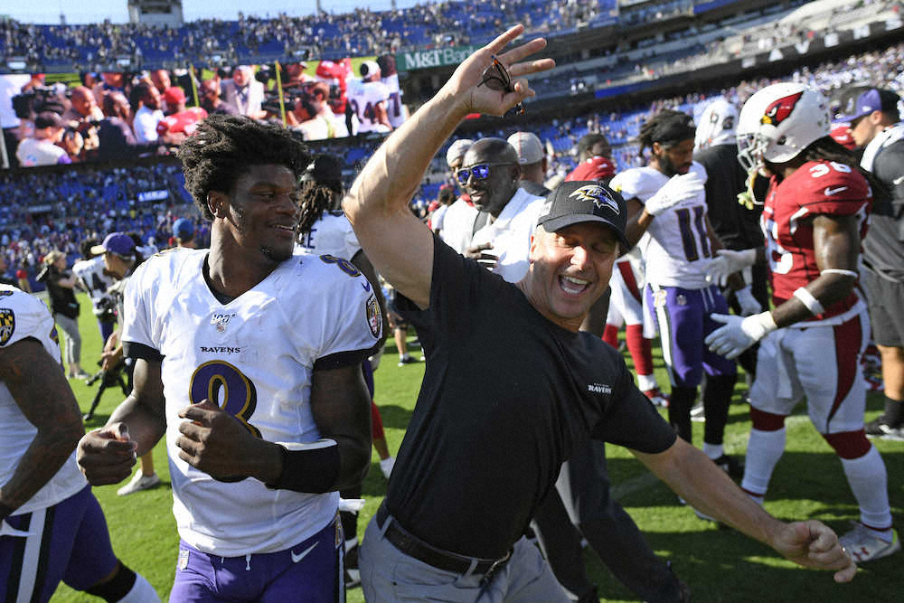 NFLは15日に各地で第2週の14試合を行い、レイブンズは地元ボルティモアでカージナルスを23―17(前半17―6)で下して2戦2勝。2季目を迎えたQBラマー・ジャクソン(22)が37回中24回のパスを通して272ヤードと2TDをマークし、得意のランでも16回のキャリーでチーム&自己最多の120ヤードを走破してチームを勝利に導いた。パスで250ヤード以上を稼いで120ヤード以上をランでクリアしたのはジャクソンが史上初。昨年のドラフト1巡目の最後となる32番目に指名を受けたルイビル大出身のジャクソンは、昨年11月19日のベンガルズ戦で119ヤードをランで獲得しており、QBでありながら1試合で115ヤード以上を2回記録したのは、1970年以降ではマイケル・ビック(元ファルコンズ=6回)らを含めて史上4人目となった。