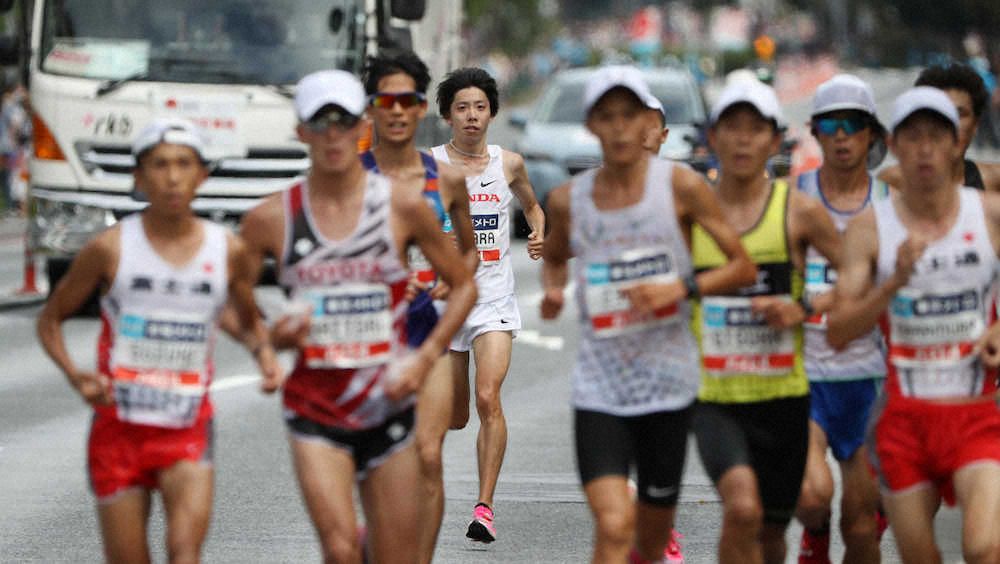 37キロ付近、大迫(右から5人目)ら集団に抜かれる設楽(左から4人目)(代表撮影)