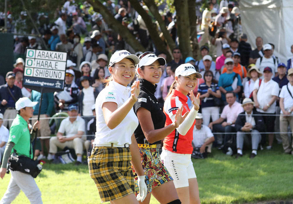 しかし、いったん、プレーに戻るとすぐに真剣モードに。3人ともに2アンダーで迎えた12番パー5(545ヤード)ではドライバーの平均飛距離14位(245・73ヤード)の渋野が同4位(252・41ヤード)の原を約20ヤード近くもアウトドライブし、残り247ヤードの第2打を3Wでピン右15メートルに運んで楽々バーディー。笑顔やハイタッチではなく本来の攻撃ゴルフでファンを沸かせた。