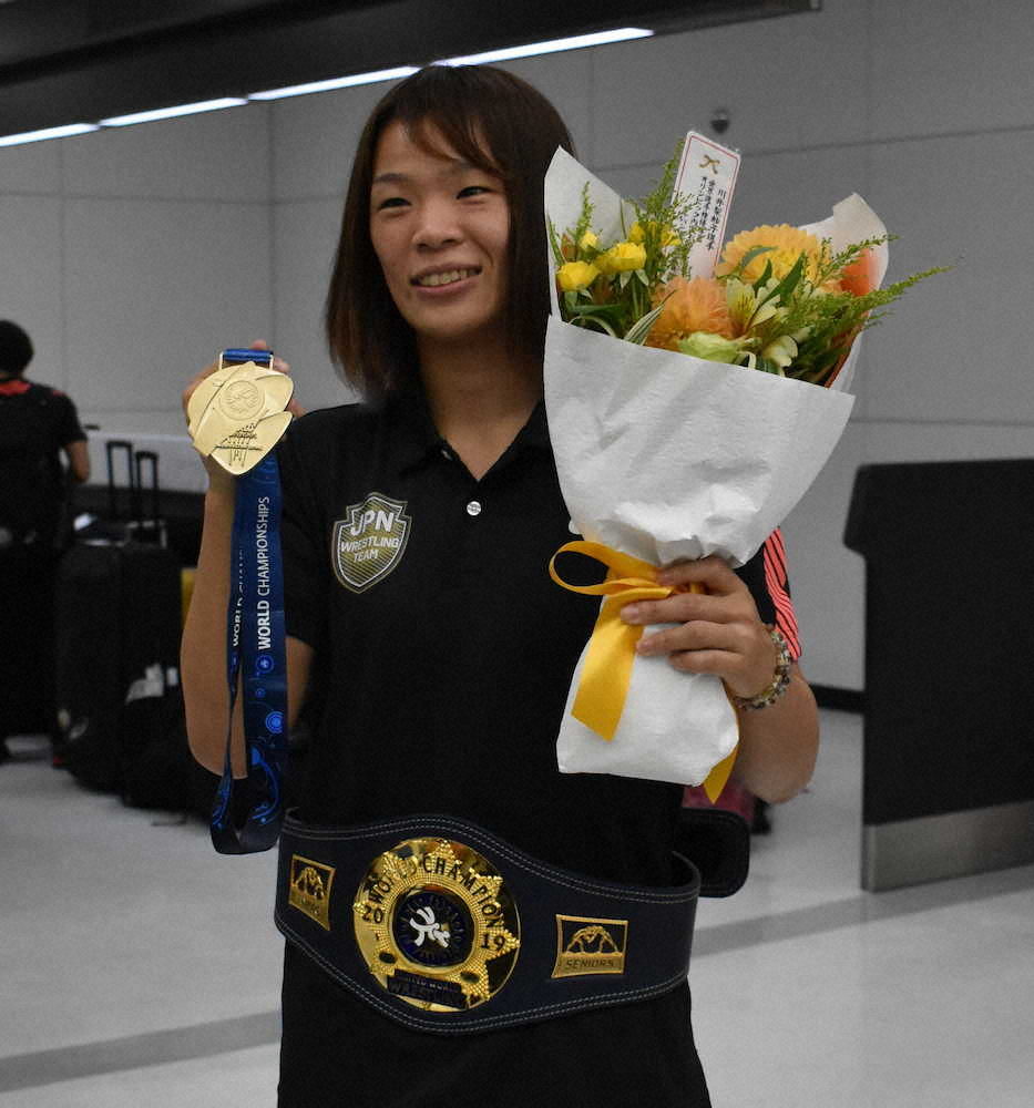 レスリングの世界選手権(カザフスタン)で東京五輪代表内定を決めた女子57キロ級金メダルの川井梨紗子(24=ジャパンビバレッジ)らが23日、成田空港に帰国した。
