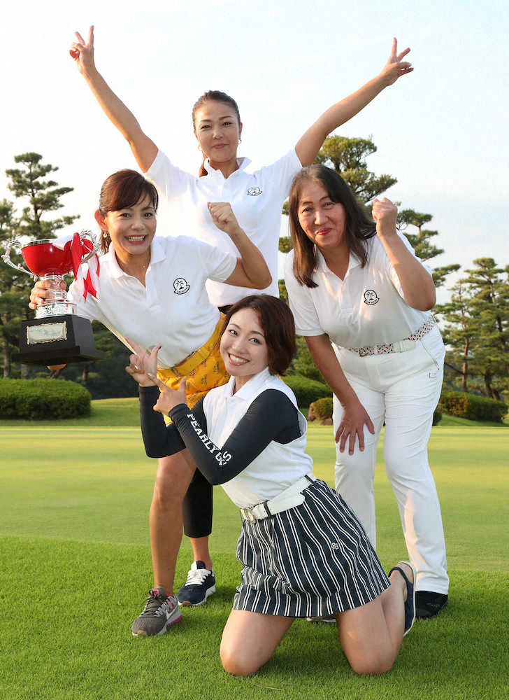 <第53回西日本クラブ対抗レディスゴルフ大会>団体の部で優勝し喜ぶ、若宮Bチーム(撮影・中村達也)