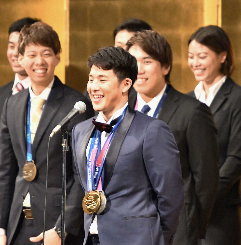 7月に韓国・光州で開催された水泳世界選手権の報告会が都内で行われた。金メダル2個、銀メダル1個を獲得した瀬戸大也(25=ANA)は25メートルプールで争う10月の日本短水路選手権(26、27日、辰巳)の400メートル個人メドレーでの世界記録を宣言。「短水路で世界記録を出して東京五輪の金メダル獲得に弾みをつけたい」と力を込めた。
