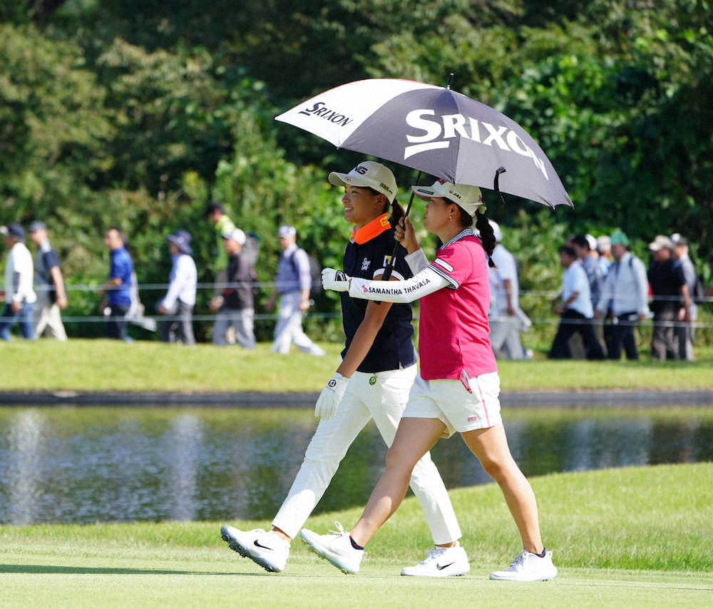 18番、相合い傘で第2打地点に向かう渋野(左)と勝みなみ(撮影・沢田 明徳)
