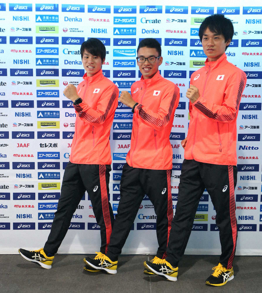 <世界陸上第6日>会見でポーズを決める男子20キロ競歩の(左から)池田向希、山西利和、高橋英輝(撮影・小海途 良幹)